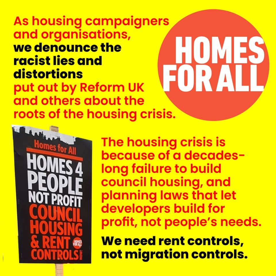 As housing campaigners and organisations, we denounce the racist lies and distortions put out by Reform UK and others about the roots of the housing crisis.